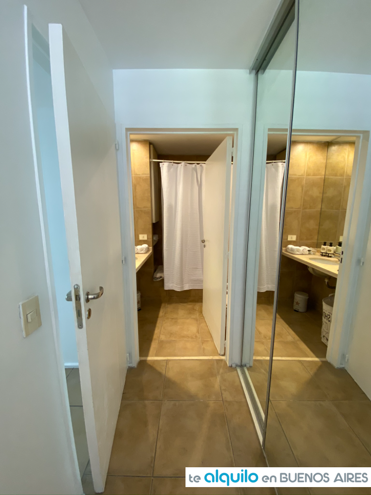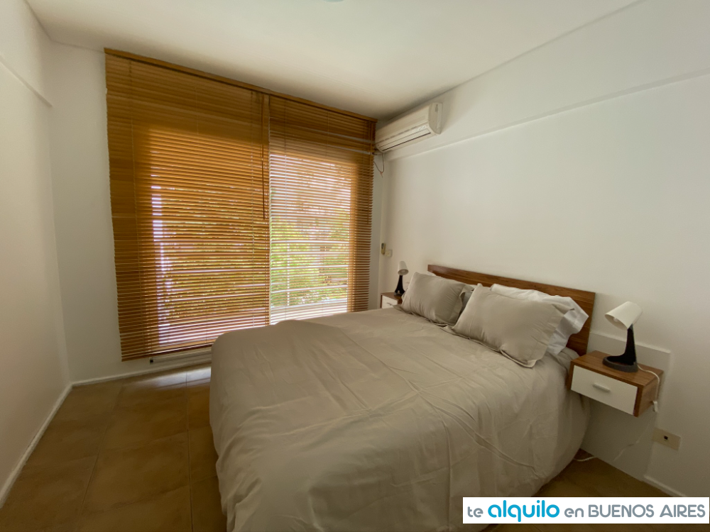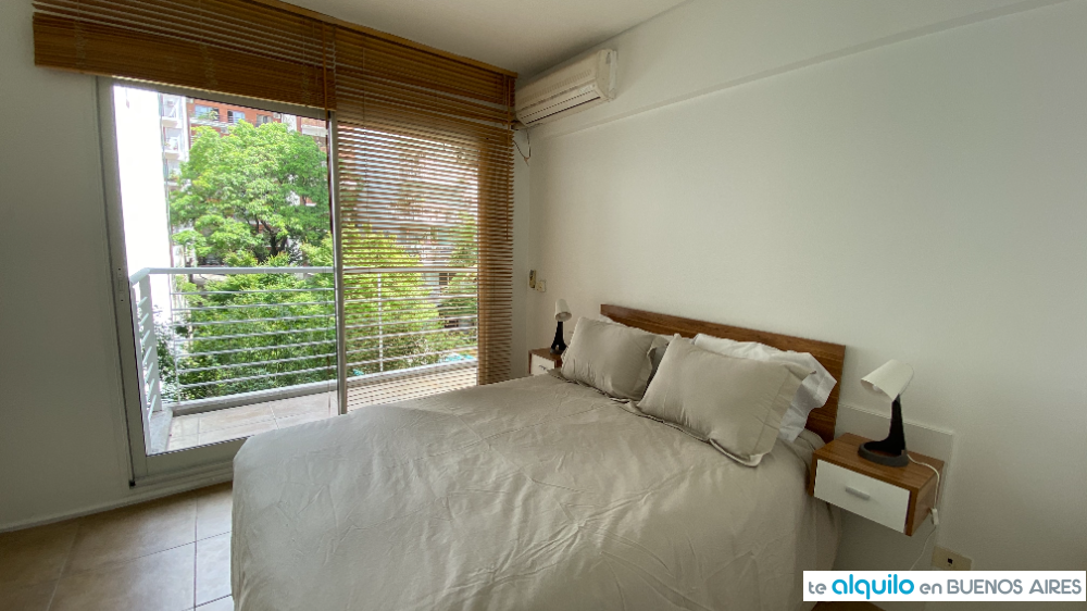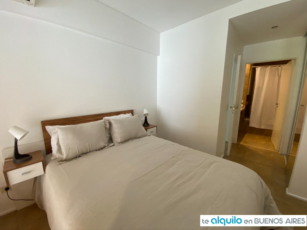 Dormitorio con cama doble, salida a balcón. Baño completo. Placard con puertas espejadas.