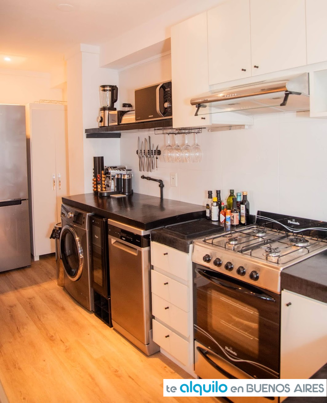 Cocina completamente amoblada y equipada con lavavajillas, tiene comedor diario.
